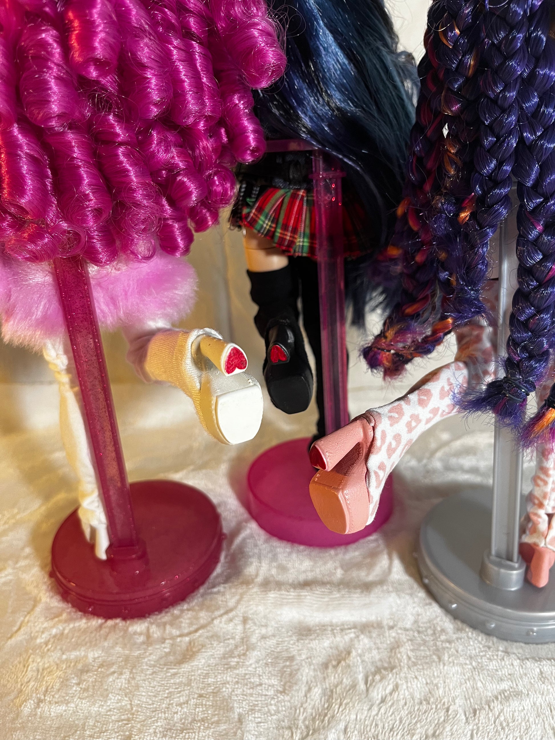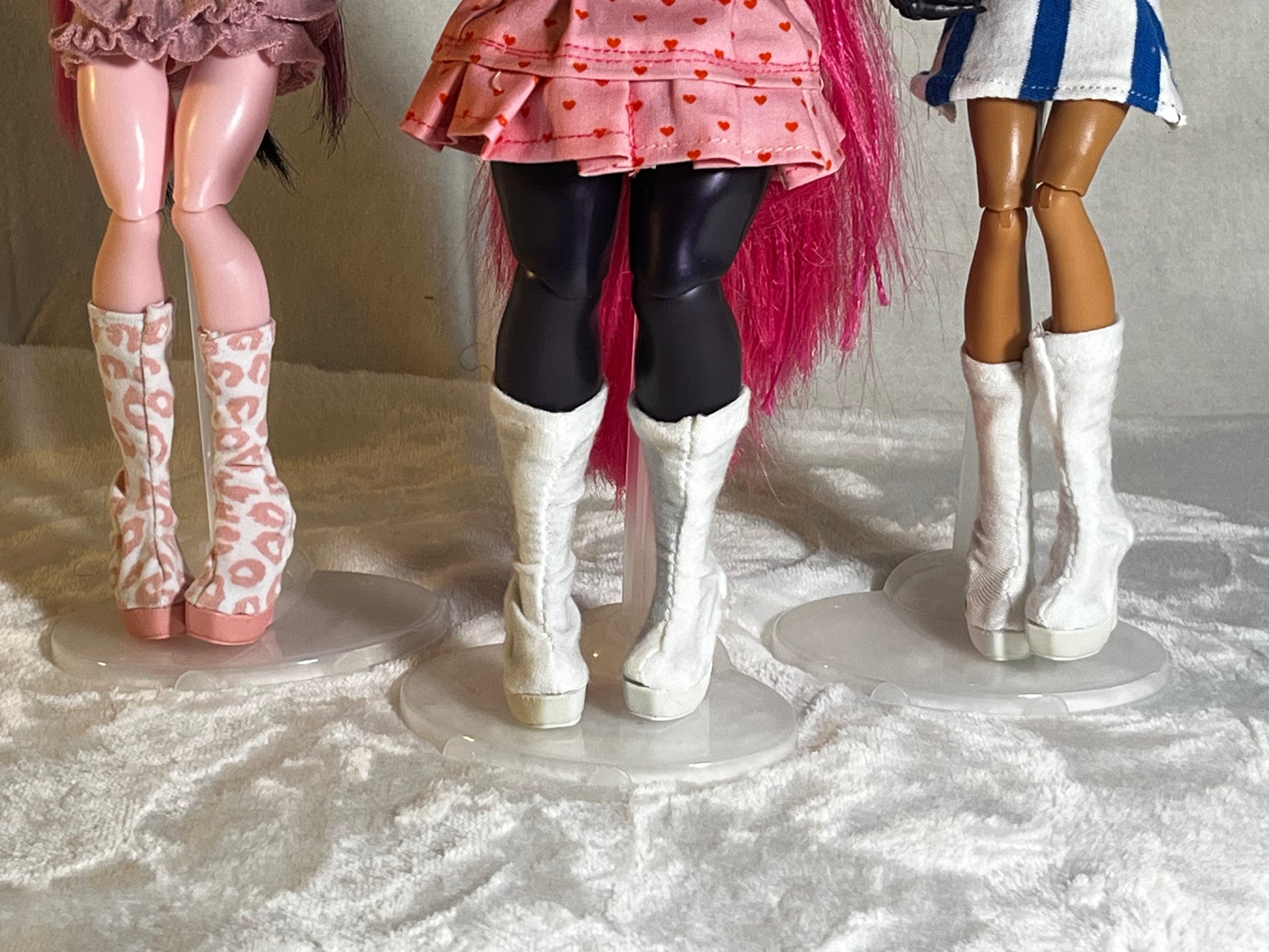 These fabric Gogo boots have soles printed in a stiff resin and hand painted with acrylic paint in either pink, white, or black with a red heart on the heel. These boots come in both thigh high and calf lengths! All shoes are sealed with Krylon matte spray. These shoes fit on Rainbow High, G3 Monster High*, and Sew Fierce dolls!